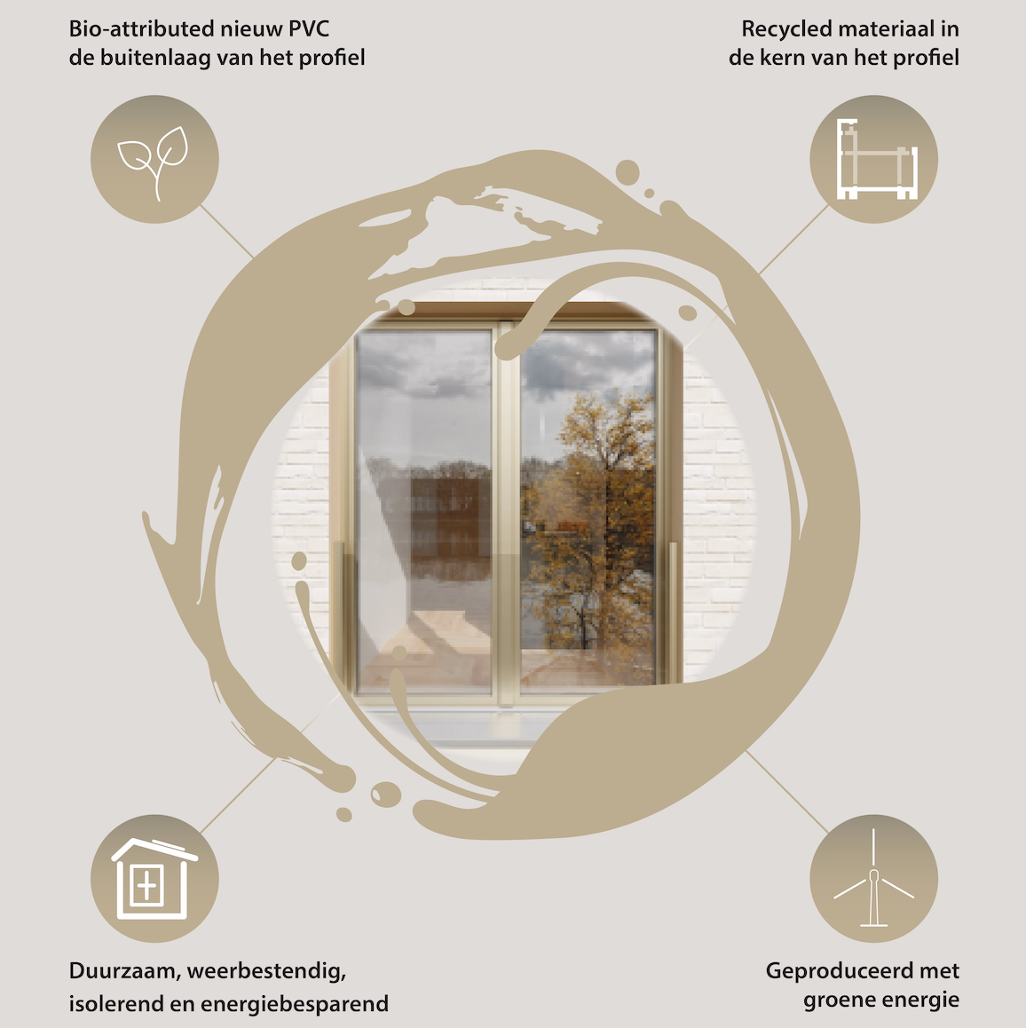 BALANCE-kozijnprofielen leveren een actieve en bewezen bijdrage aan het behoud van grondstoffen en van CO2-reductie, door het gebruik van bio-attributed PVC.